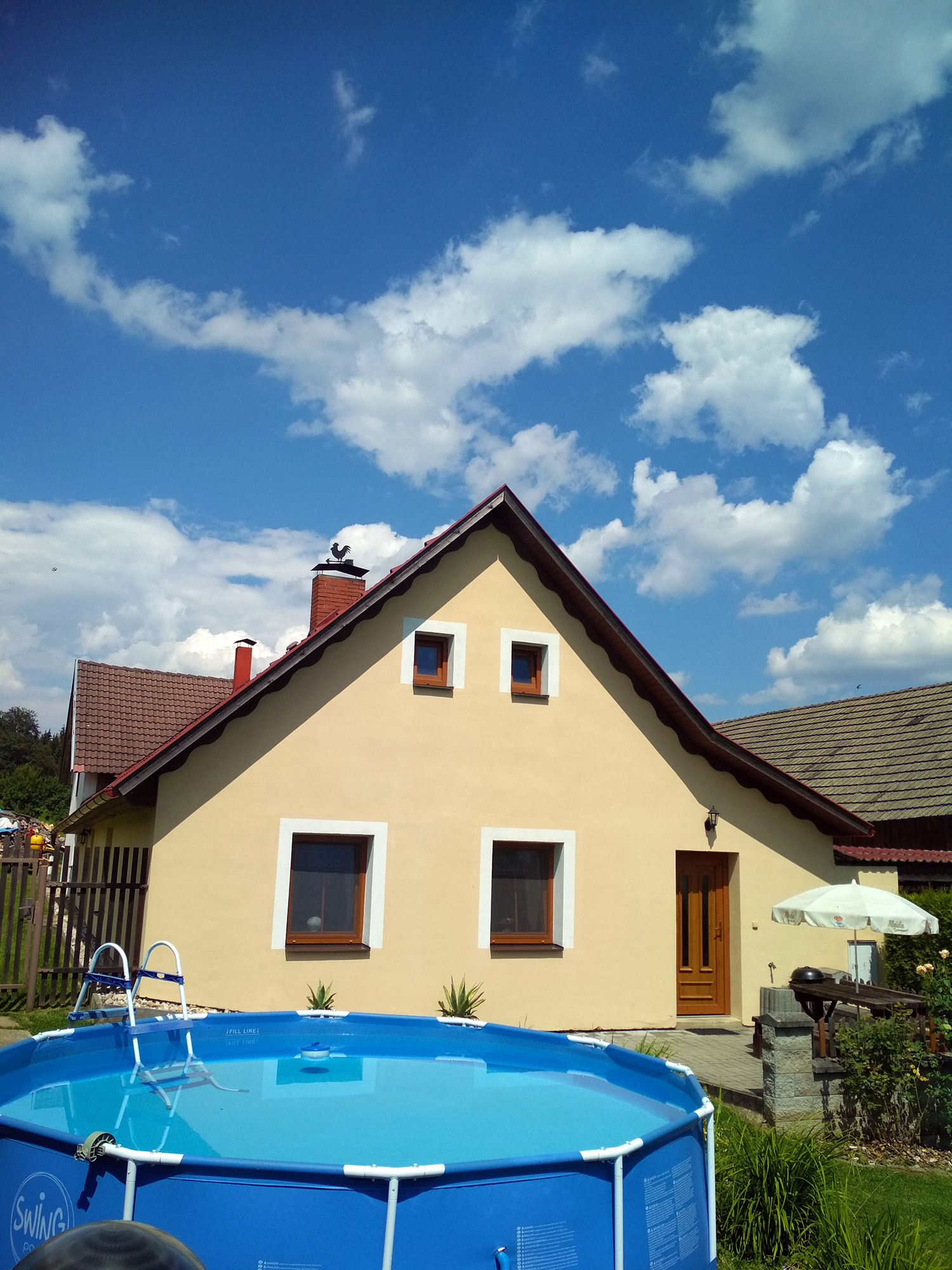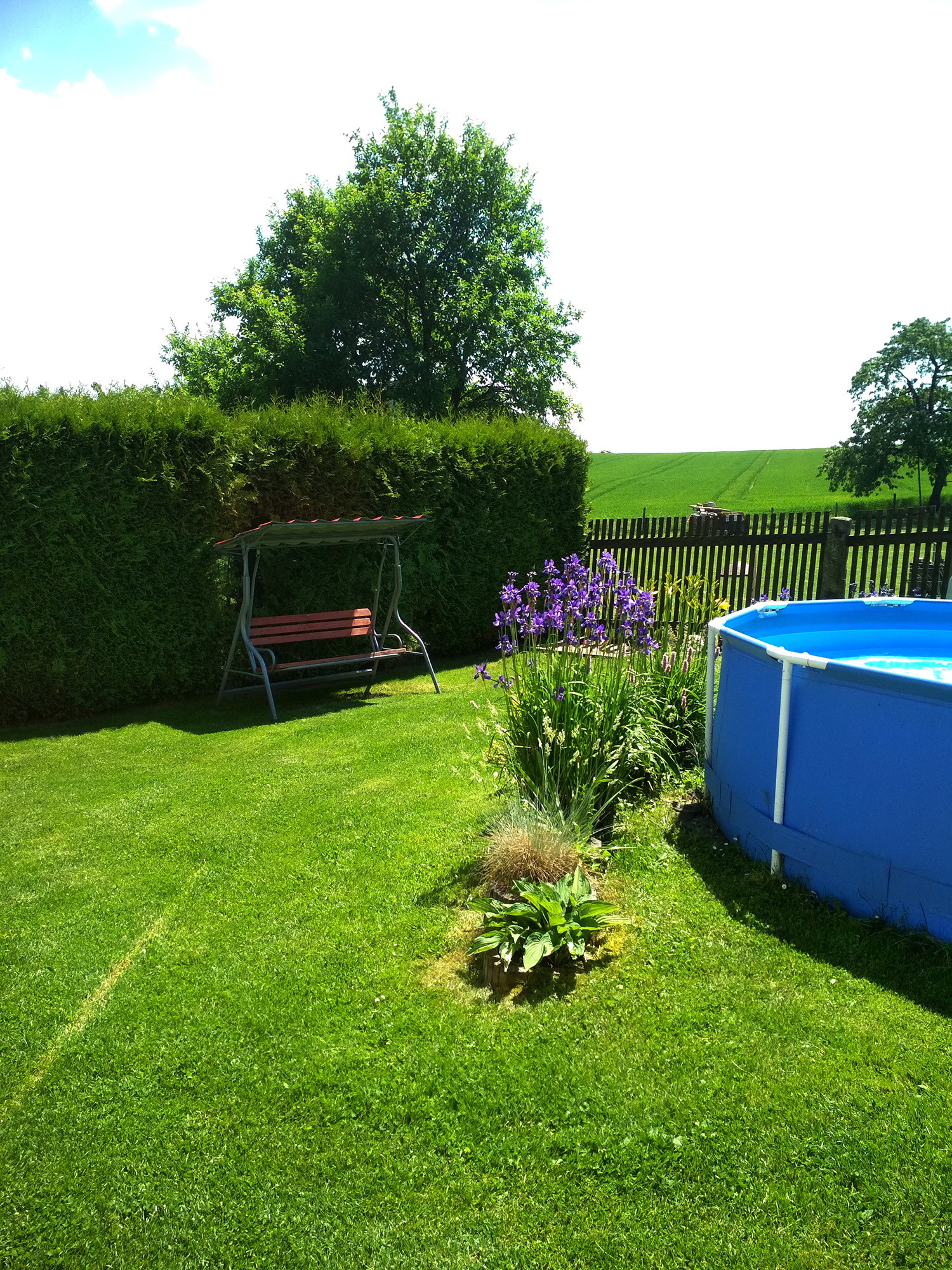 Na zahradě je dětské pískoviště a bazén s pískovou filtrací o rozměru 3,6m x 0,9m.