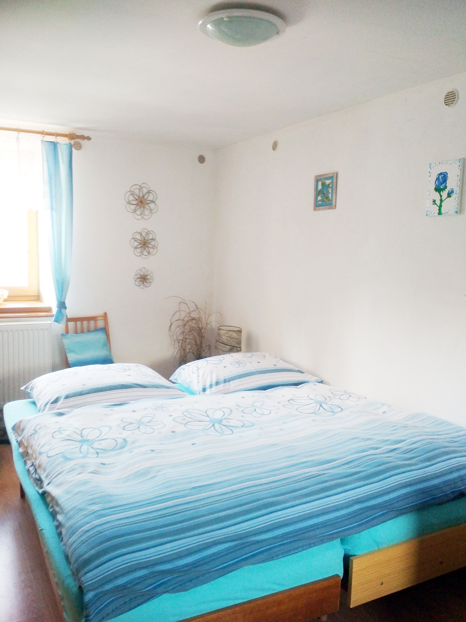 Další ložnice je přes chodbu s dvěma lůžky a dětskou postýlku.